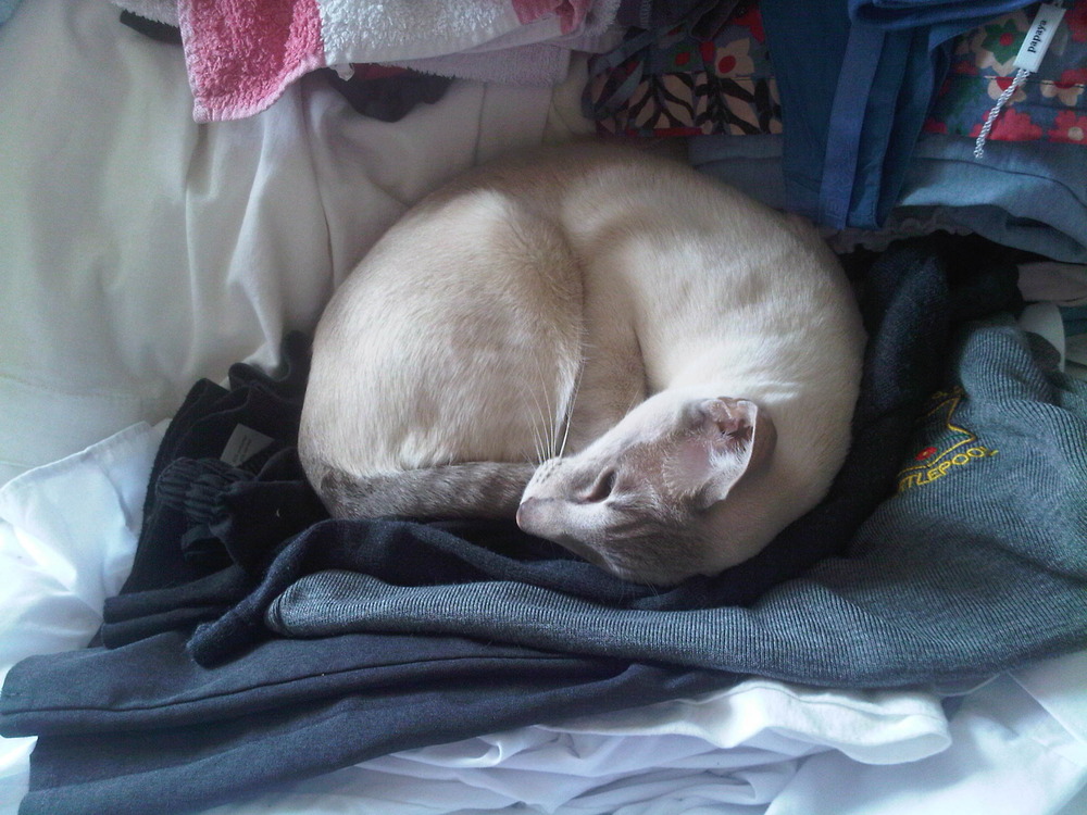 Cosmo found Isobel and Ted’s pile of clean school uniform. I caught him just as he was settling down for comfortable sleep and chased him.