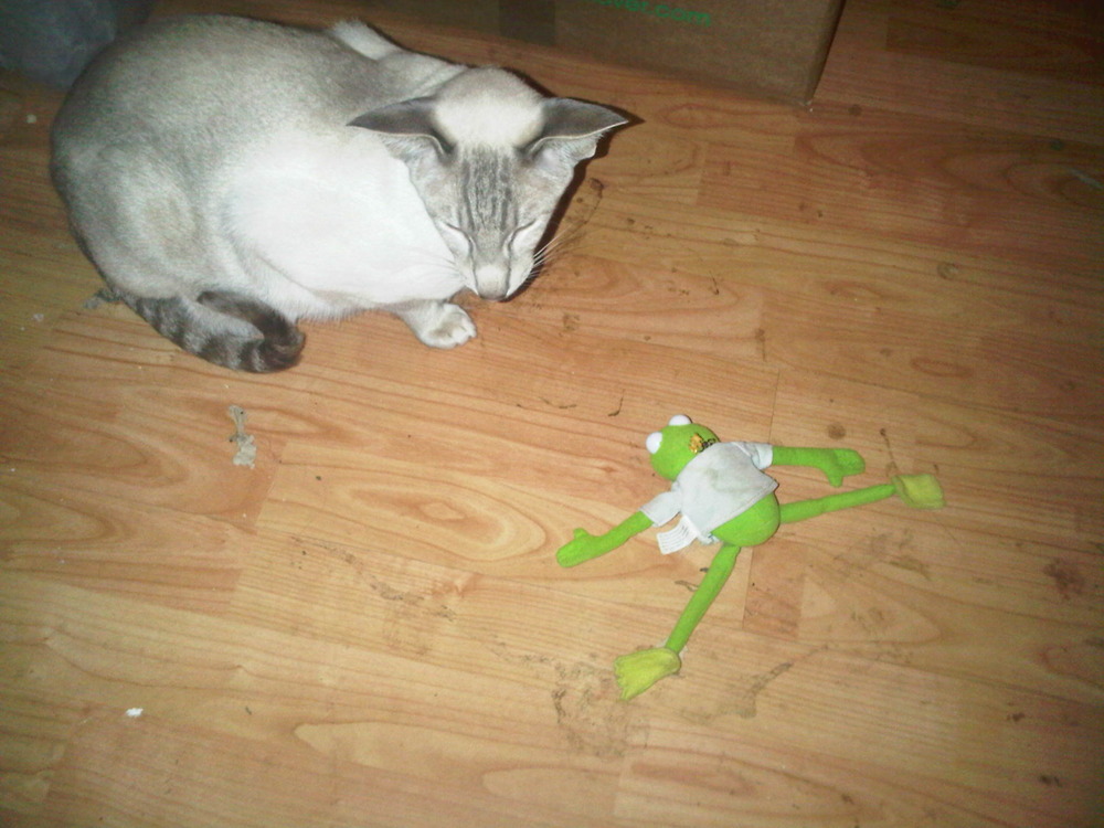 A Cat A Day: 113/365 April 23, 2011 by Fiona Joyce Cat vs. frog. Kermit the Frog. Cosmo has issued a death sentence on this Muppet. Sent using BlackBerry® from Orange Share this: Click to share on X (Opens in new window) X Click to share on Facebook (Opens in new window) Facebook Like Loading... Related
