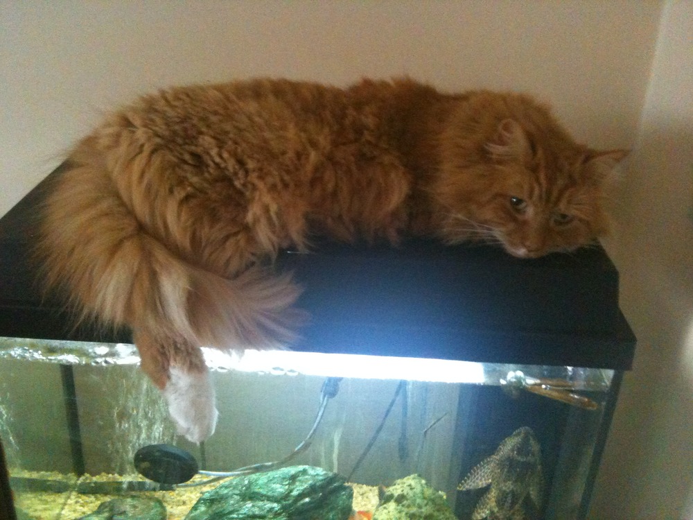 Yesterday, we had a cat and a dog, today we have a cat and some fish, courtesy of James Bancroft. This is Gizmo, keeping the closest possible eye on a very odd-looking fish (sorry James, I am a fish-ignoramus). Gizmo looks very comfortable and warm.