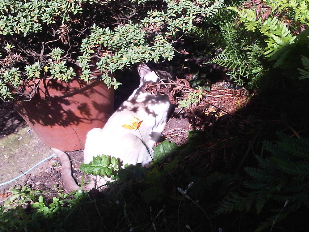 It’s been a very hot day in most of the UK today. Rosie lazing in the sunshine under the Hebe and among the ferns.