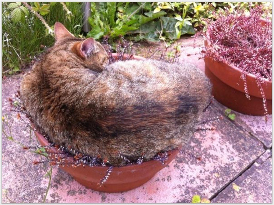 One of @Rantingteacher’s four cats Mehefin, familiarly addressed as MevMev, enjoying the sunshine curled up on a plant pot of heather. As one does.