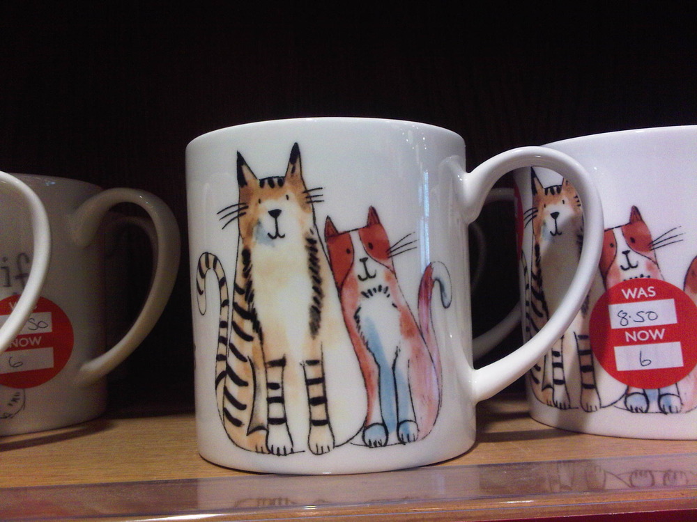 I stepped out of my normal life routines this weekend; I spent Saturday stimulating my professional brain and enjoyed brunch with my daughter and lovely friends at Café Rouge in Durham today. Afterwards, we wandered into the Whittard tea and coffee shop. Isobel chose some Turkish Apple tea and I bought a pretty blue cup with hand-painted white stars. I liked this cat-themed mug, but wasn’t tempted to buy it. My love is living, furry, purring cats, not cat pictures, calendars, mugs or other knick-knacks.