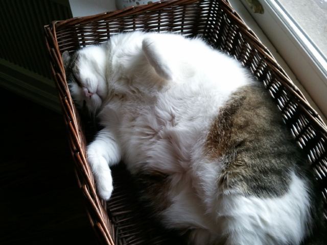 My Canadian friend Sylvia tweeted this photograph of her sister’s cat Scarlett at the weekend. Fluffy Scarlett has found a way of squeezing into this basket so that she can lie right down and snooze on her sunny window sill. To be honest, I don’t think it even looks that comfortable, but I have lost count of the number of times I have seen a cat fast asleep in an awkward position. I think they relax so much that they forget how squashed they really are.