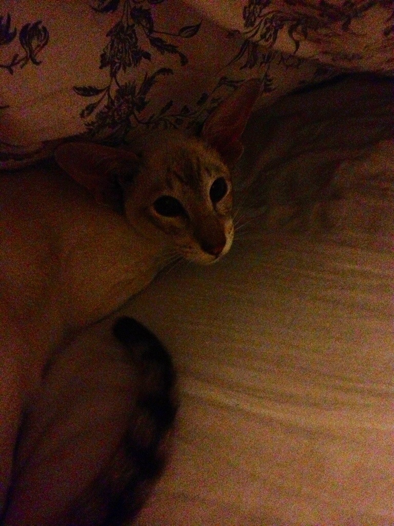 I digress. When I reached my bed, I found Milka hiding under the duvet, waiting to attack me. The picture is dark, but that’s how it is under the bedclothes.