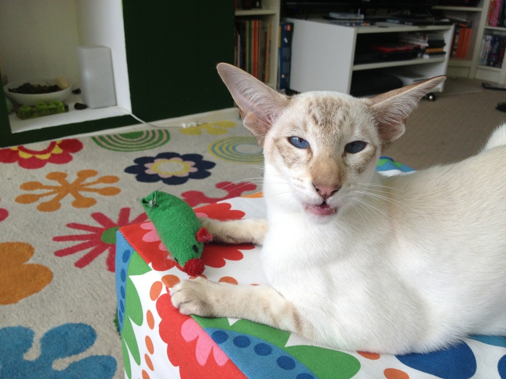 A Cat A Day 2013 #216 August 5, 2013 by Fiona Joyce Oops, didn’t post yesterday. Here is Milka meowing at me, because he wants me to play fetch. Can you spy his green mousie? I have to throw it repeatedly and he brings it back like a dog. Siamese do stuff like that, which is why I love them. Share this: Click to share on X (Opens in new window) X Click to share on Facebook (Opens in new window) Facebook Like Loading... Related