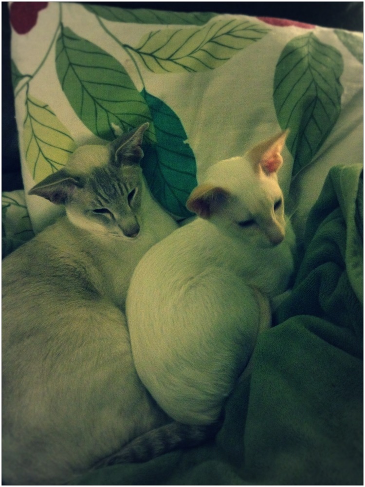 All three of our resident cats have now accepted Florence the kitten. You see me here trapped under her and Malteser and therefore unable to go to bed, because I was so pleased I didn’t want to disturb them.