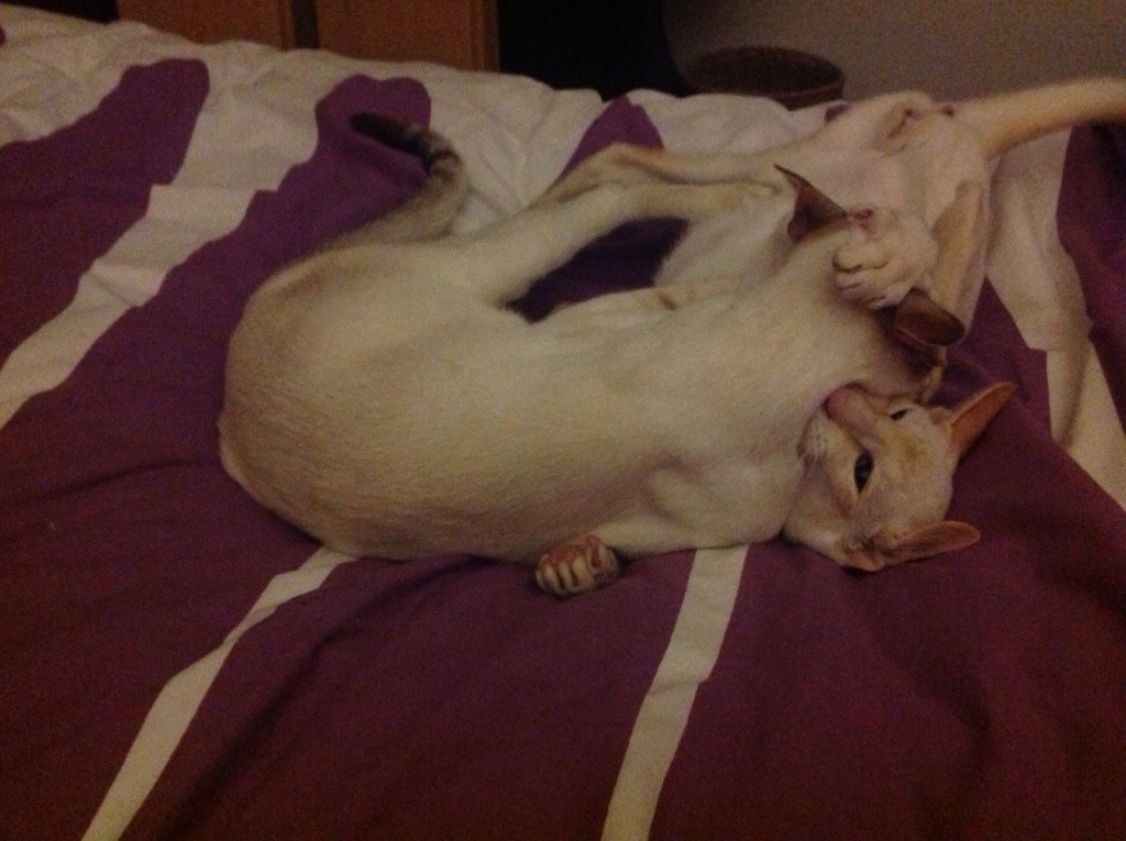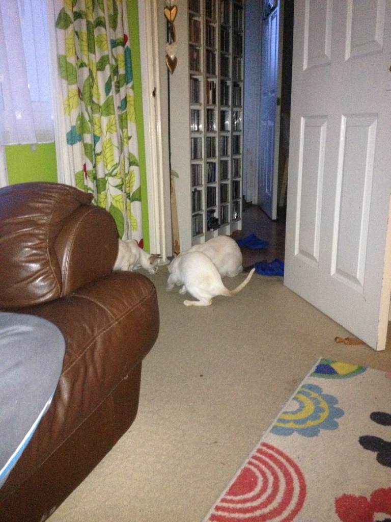 Home again. The cats forgave us amazingly quickly for leaving them and we’re nearly back to normal. In this photograph, they seem to have found something fascinating to sniff near the living room doorway.