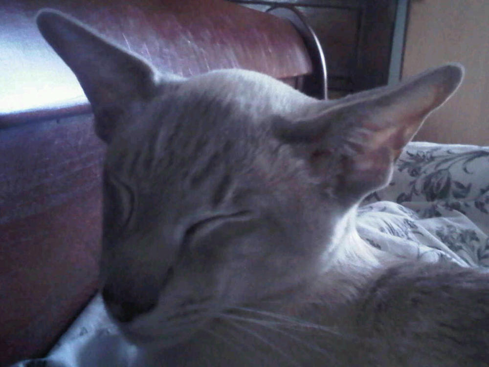 Is Cosmo bored or shy? Trying for a quiet snooze on mum and dad’s bed.
