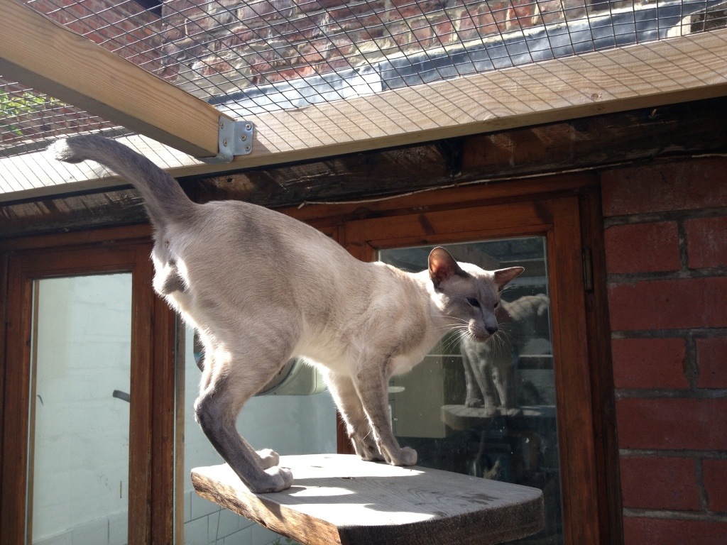 This is Rio, who is a blue-point Siamese stud male. He belongs to Jo (our breeder) and is very good at his job, having fathered three litters of kittens over the space of nine days in his first attempts at the age of seven months. No wonder, with such handsome, ahem … ‘accoutrements’. He spends most of his time in a well-equipped pen outside Jo’s house, because whole males can be rather smelly. In a way it’s a pity, because Rio is so friendly and he loves people. He’s allowed in the house if he’s wearing his special pants. Hilarious!