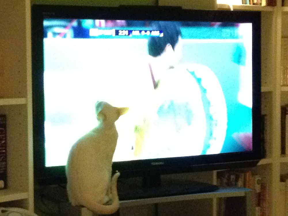 A little insight into Saturday night at Joyce Towers. Dinner on tray in front of Take Me Out, because we like trash tv and are very common. I’m very disapproving of John feeding the kitten sirloin steak, aren’t I?